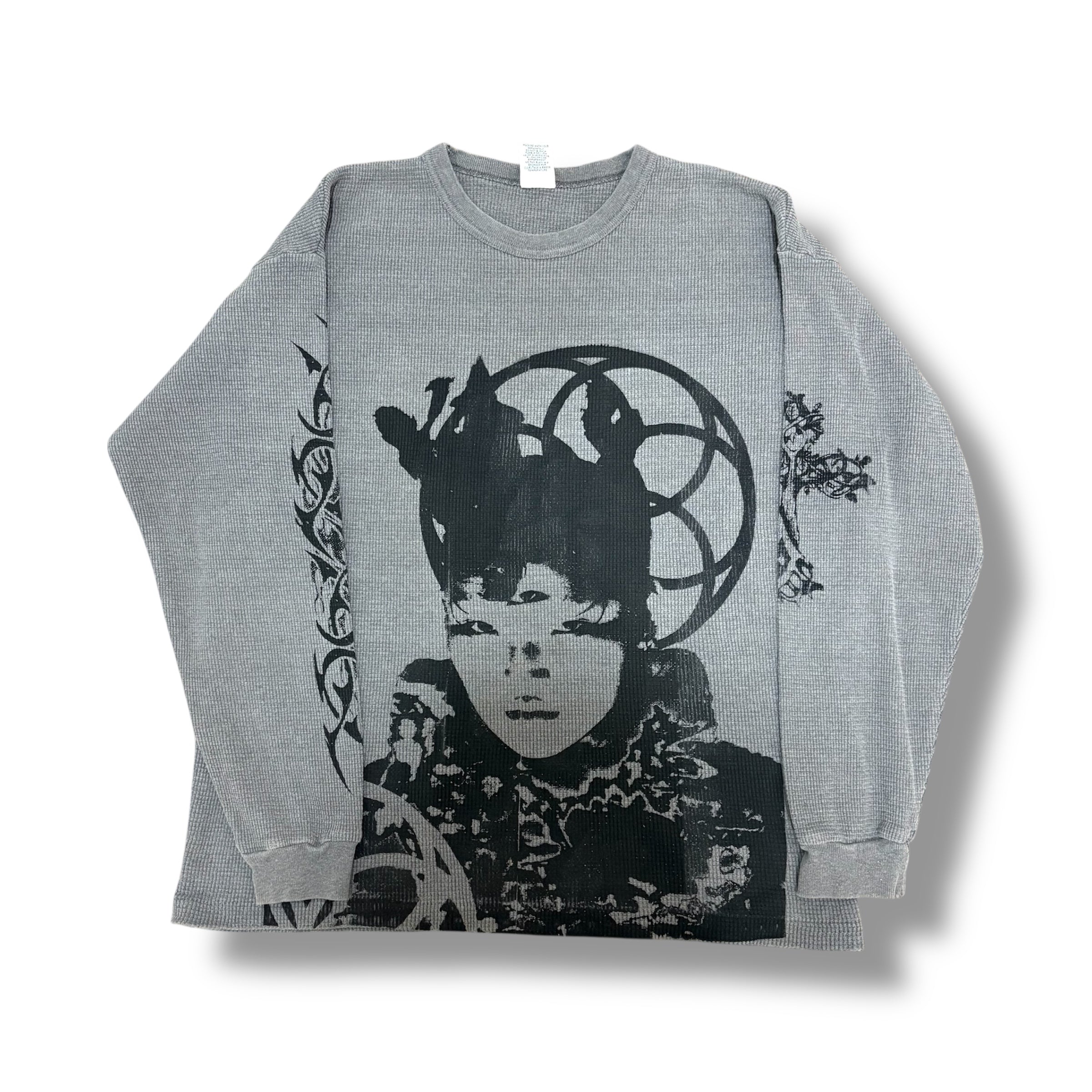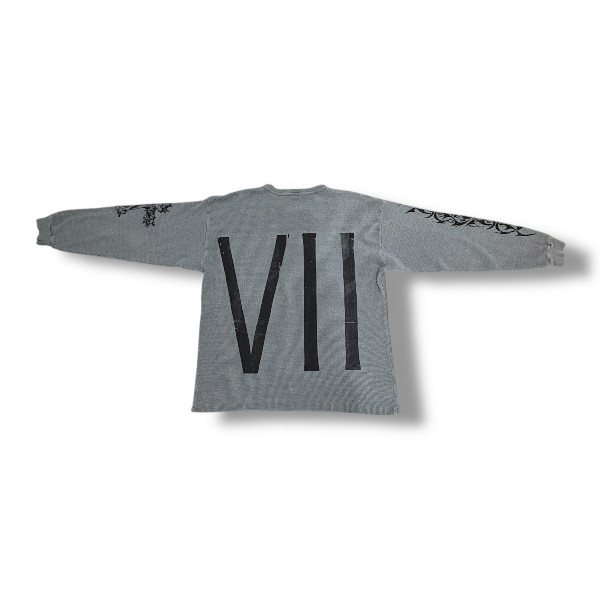 1/1 DARK GREY VINTAGE GAP OG PRINT WAFFLECUT LONGSLEEVE (M) WITH THE FIRST SUKOYA PRINT SCREEN PRINTED ON FRONT, VII ON THE BACK, NEW GRAPHIC ON RIGHT SLEEVE, AND TREE CROSS ON LEFT.