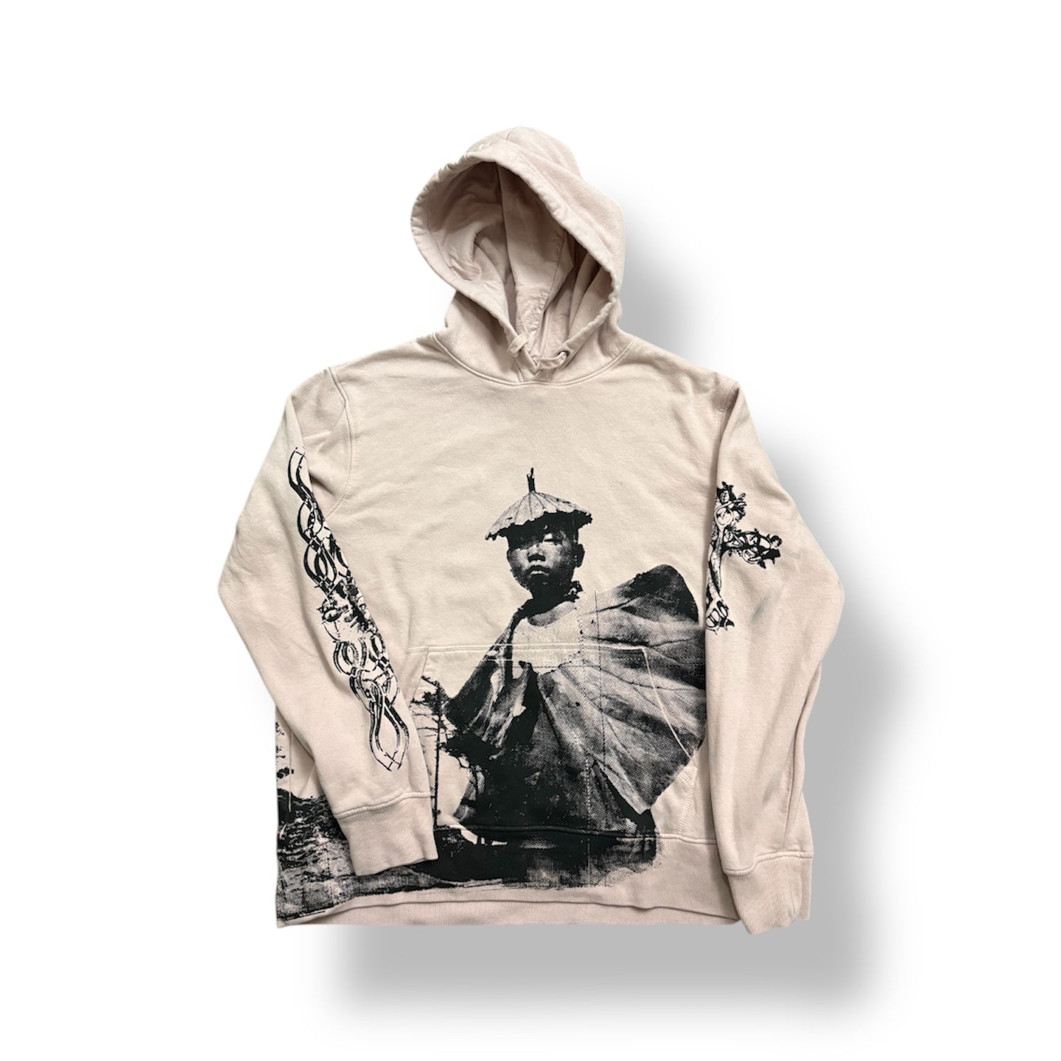 1/1 {{EXCLUSIVE}} 1950S UKN KD SANDY PINK HOODIE (XL) WITH NEXT WAVE GRAPHIC 1950S UKN KD SCREEN PRINTED ON FRONT, VII ON THE BACK, NEW GRAPHIC ON RIGHT SLEEVE, AND TREE CROSS ON LEFT.