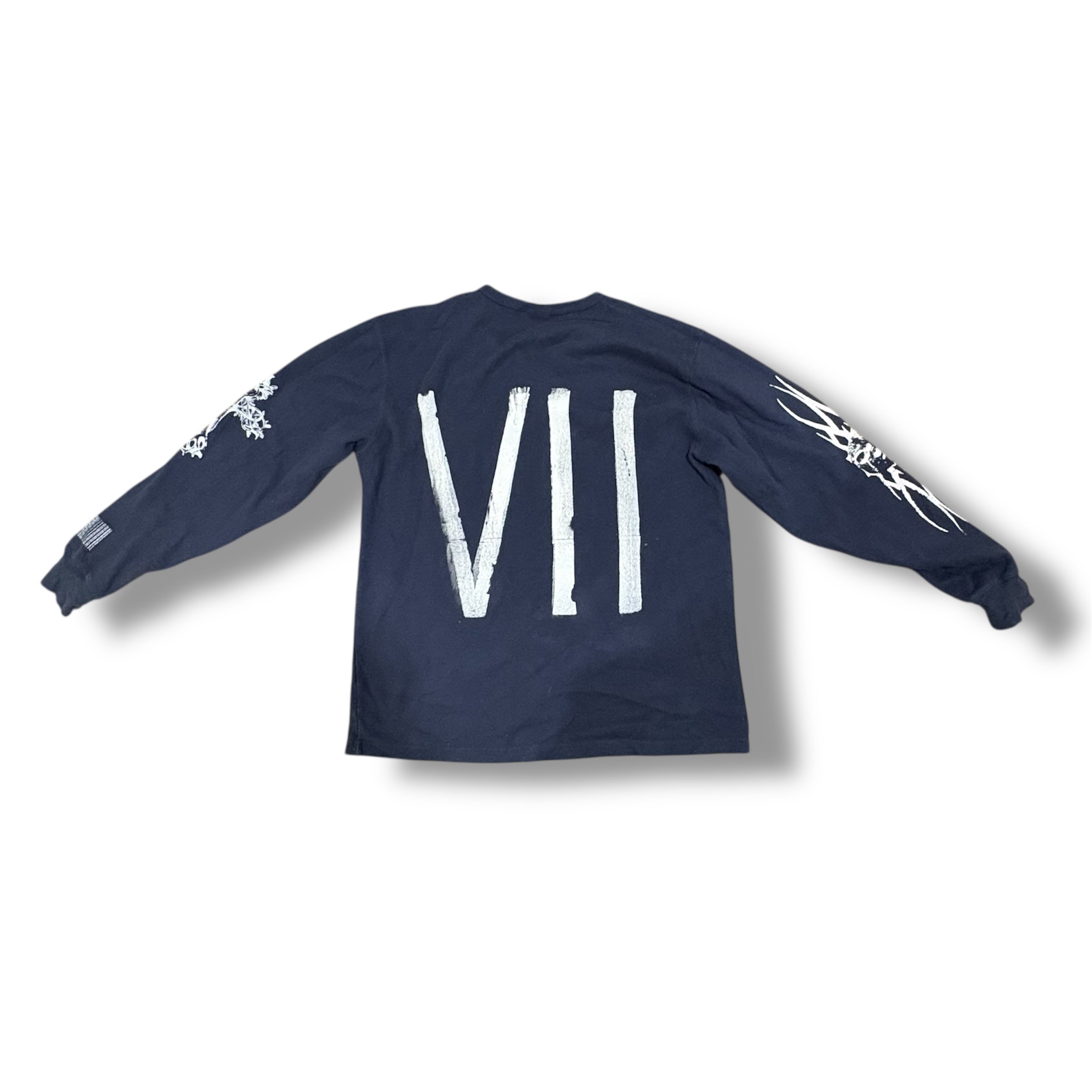 1/1 {[ EXCLUSIVE FROM FIRST DROP]} NAVY STEVE & BARRY OG MUSTANG LONGSLEEVE (XL) WITH THE FIRST SUKOYA PRINT SCREEN PRINTED ON FRONT, VII ON THE BACK, NEW GRAPHIC ON RIGHT SLEEVE, AND TREE CROSS ON LEFT ALONG WITH OG NAME TAG.