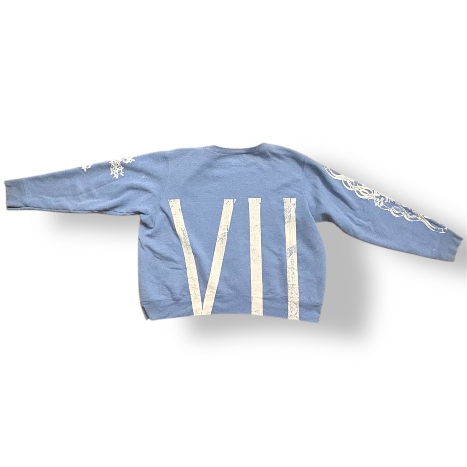 1/1 {{EXCLUSIVE}} TOSHIRO PASTEL BLUE LIGHTWEIGHT CREWNECK (L) (WOMANS CUT) WITH NEXT WAVE GRAPHIC TOSHIRO MIFUNE SCREEN PRINTED ON FRONT, VII ON THE BACK, NEW GRAPHIC ON RIGHT SLEEVE, AND TREE CROSS ON LEFT.