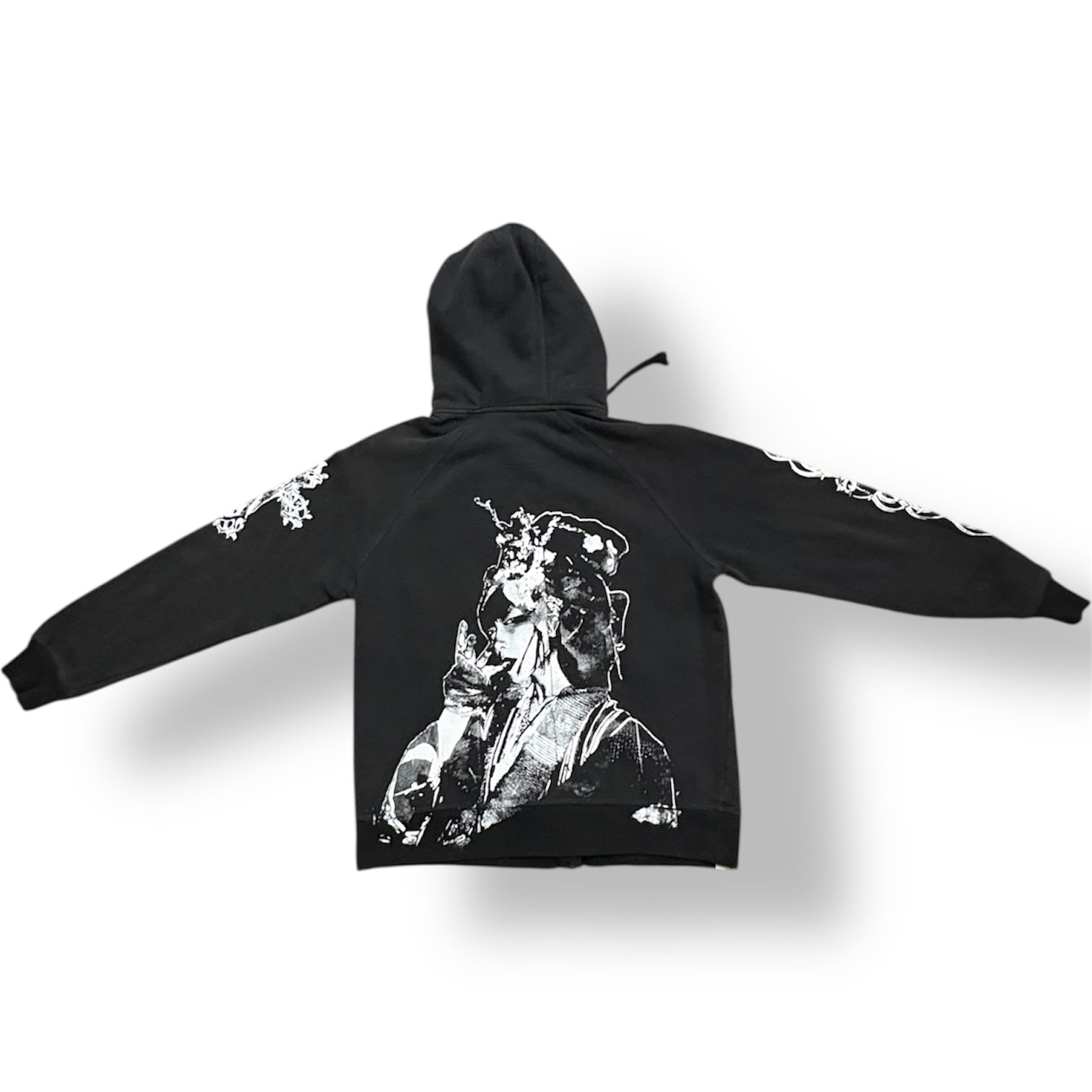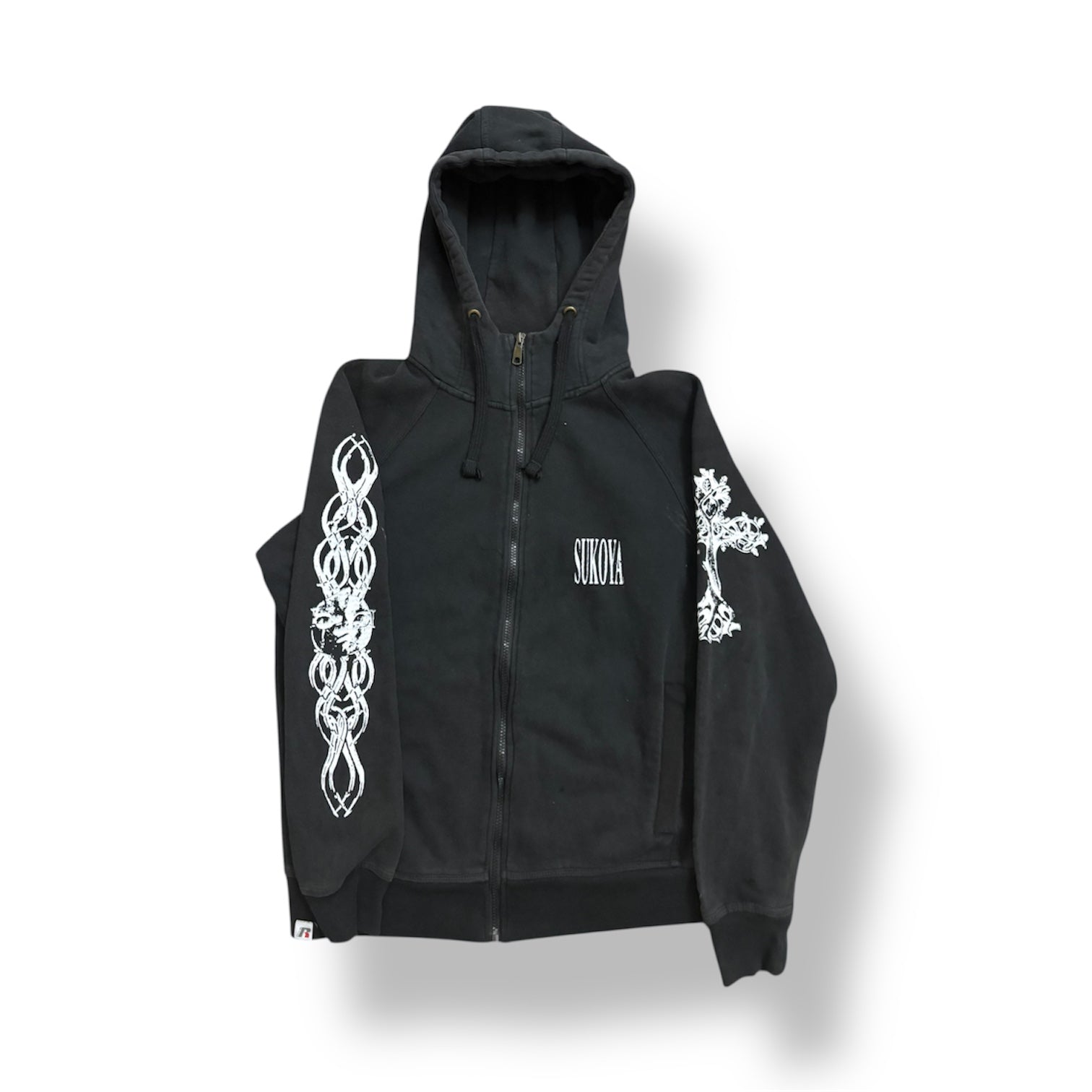1/1 REEBOK SAYOKO YAMAGUCHI BLACK ZIP UP HOODIE (M) WITH NEW SAYOKO YAMAGUCHI SCREEN PRINTED ON BACK, SUKOYA ON THE FRONT, NEW GRAPHIC ON RIGHT SLEEVE, AND TREE CROSS ON LEFT.