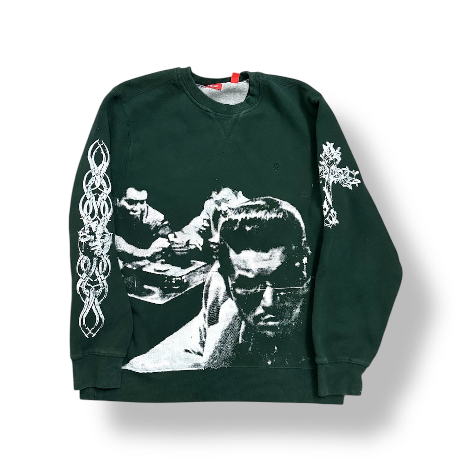 1/1 UKN (JS + JDS) FOREST GREEN CREWNECK (L) WITH NEW UKN (JS + JDS) SCREEN PRINTED ON FRONT, VII ON THE BACK, NEW GRAPHIC ON RIGHT SLEEVE, AND TREE CROSS ON LEFT.
