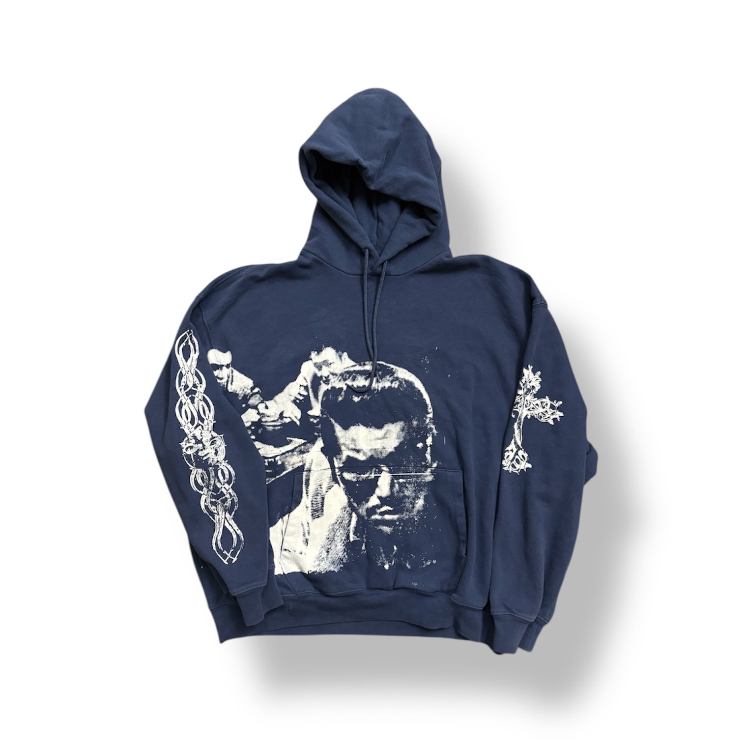 1/1 UKN (JS + JDS) NAVY BLUE GAP HOODIE (XL) WITH NEW UKN (JS + JDS) SCREEN PRINTED ON FRONT, VII ON THE BACK, NEW GRAPHIC ON RIGHT SLEEVE, AND TREE CROSS ON LEFT.