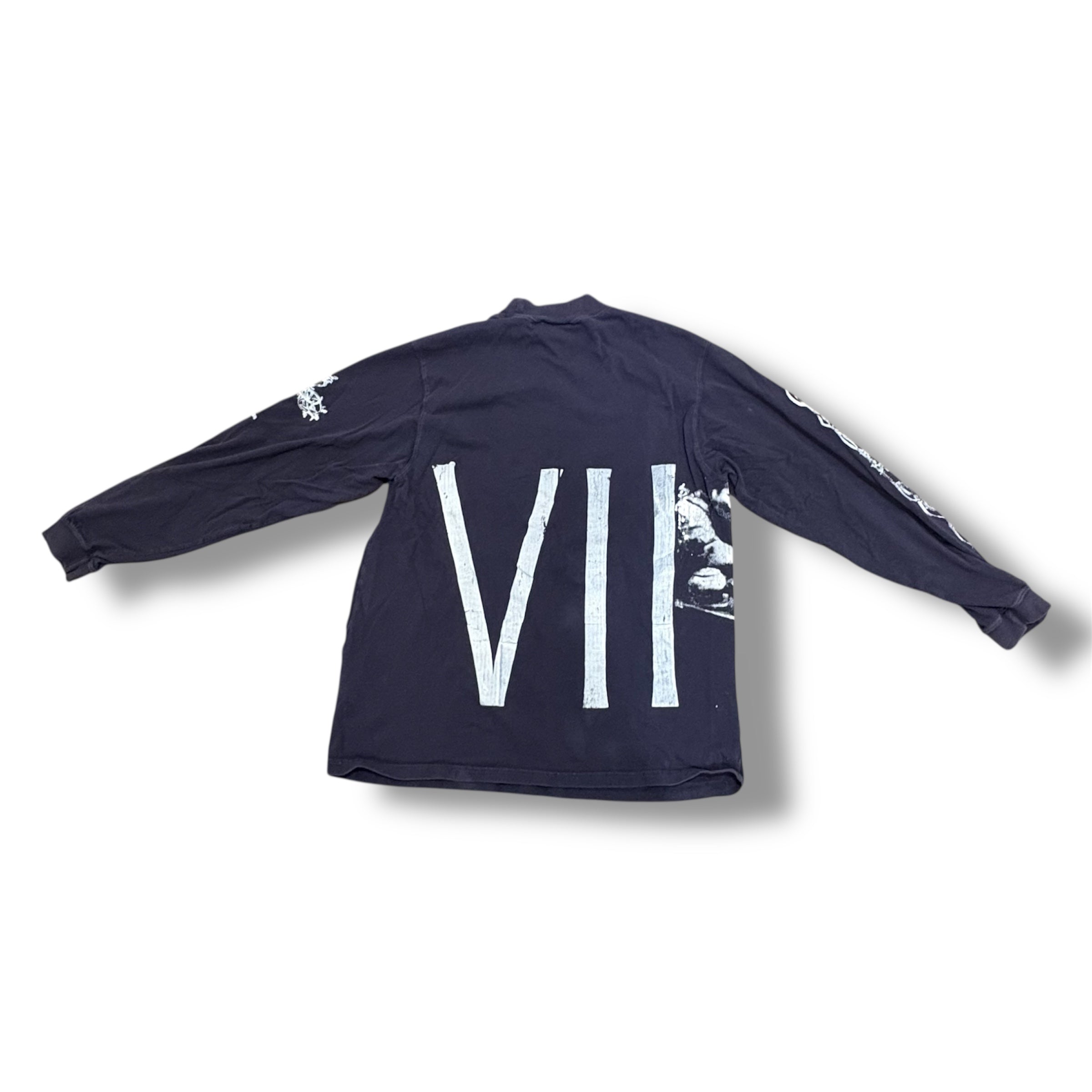 1/1 UKN (JS + JDS) NAVY BLUE LONGSLEEVE (XL TALL) WITH NEW UKN (JS + JDS) SCREEN PRINTED ON FRONT, VII ON THE BACK, NEW GRAPHIC ON RIGHT SLEEVE, AND TREE CROSS ON LEFT.