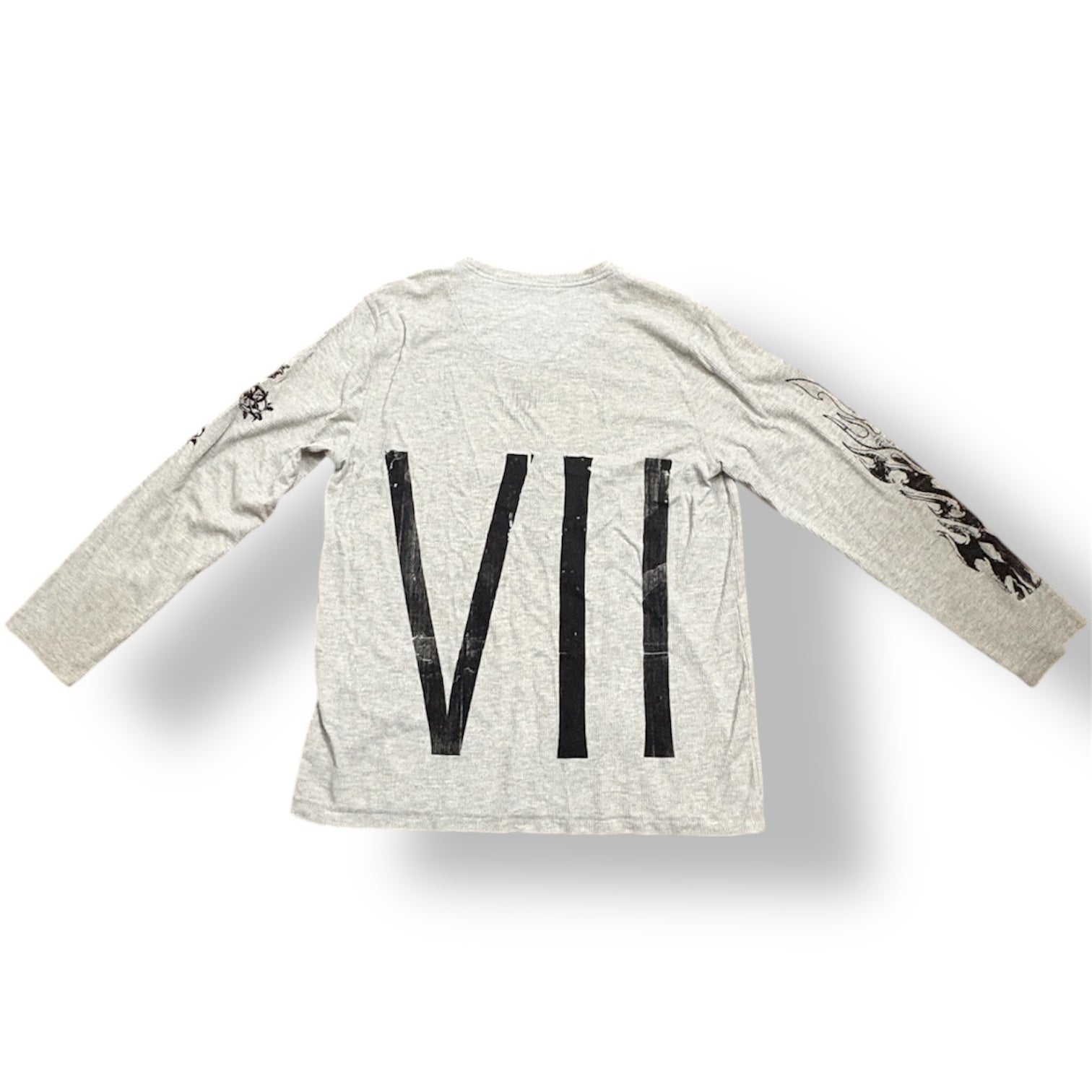 1/1 YUSAKU LIGHT GREY LIGHTWEIGHT WAFFLE CUT LONGSLEEVE (XXL) WITH NEW YUSAKU MATSUDA SCREEN PRINTED ON FRONT, VII ON THE BACK, FLAME GRAPHIC ON RIGHT SLEEVE, AND TREE CROSS ON LEFT.